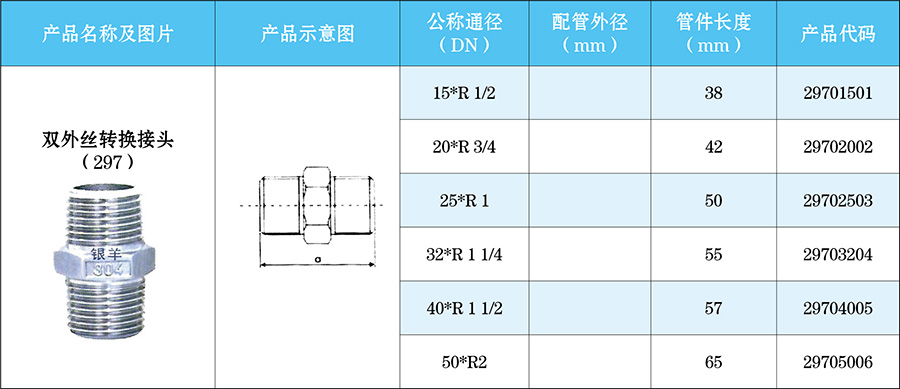 雙外絲轉換接頭適用于油、水、氣等非腐蝕性或腐蝕性介質的密封管接頭,配用鋁塑管的規格要求比較靈活,與管道連接后,具有連接牢靠、密封性能好等特點,因而在煉油、化工、輕工、紡織、國防、冶金、航空、船舶等系統中被廣泛采用;也適用于各種機械工程、機床設備等液壓傳動管路。
